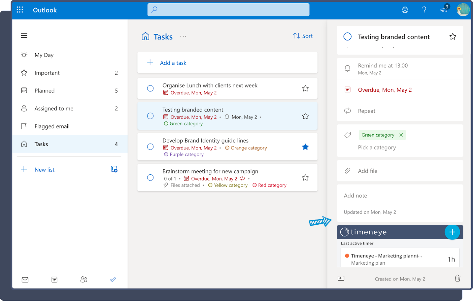 Integrating Timeneye to Microsoft Teams allows you to organize meetings, and workshops and chat with colleagues while the time gets tracked and stored in the cloud. After a meeting on Teams, you migrate with your team to Microsoft To Do, you can now assign tasks and, when completed, check them off!